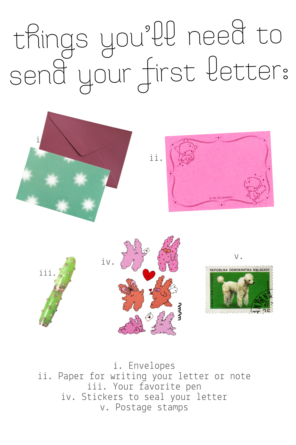Want to start writing letters? This is a non-comprehensive list of things you may need. You probably already have most things at home, so get writing!